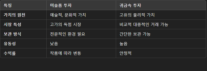 이 투자법은 각각의 장단점이 뚜렷합니다. 만약 문화적 가치를 중시하고 긴 시간 동안 작품을 감상하며 보유하고 싶다면 미술품이 적합할 것입니다. 반면, 유동성과 안정성을 우선시하는 투자자라면 귀금속이 더 나은 선택일 수 있습니다.