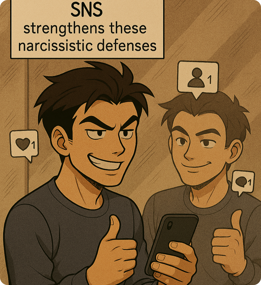오늘날 SNS와 같은 온라인 플랫폼은 이러한 자기애적 방어를 강화시키는 환경을 제공합니다. 화려한 이미지, 성취를 과장한 게시물, 끊임없는 비교 구조 속에서 사람들은 자신이 불안정하게 느끼는 부분을 숨기고, 과장된 자아상을 내세우는 경향을 보입니다.