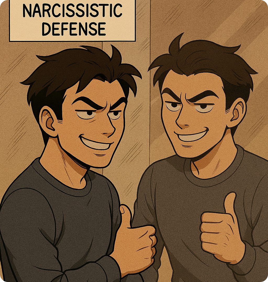 자기애적 방어는 외형적으로는 강한 자신감, 카리스마, 주도적인 태도로 보이지만, 그 이면에는 취약한 자존감이 숨어 있습니다.